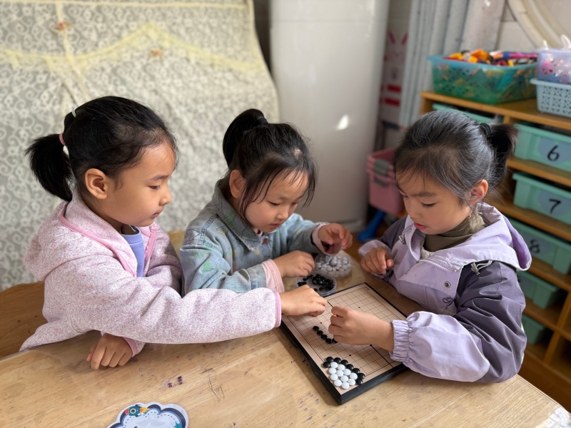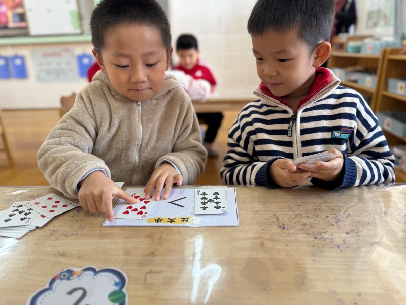 益智区里,幼儿们或两两合作玩“比大小”卡牌游戏,或围坐挑战围棋对弈,专注的小脸上满是认真;科学区的孩子则对照《神奇的磁铁》实验记录表,用磁铁探索不同材料的吸附特性,在操作中感知科学奥秘。