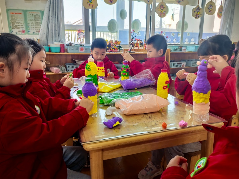 活动伊始,孩子们从家中带来了各式各样的空饮料瓶,这些日常生活中即将被丢弃的“废品”,成为了孩子们艺术创作的最佳画布。活动上,色彩鲜艳的彩泥瞬间抓住了所有孩子的眼球。在老师们的耐心引导下,孩子们了解了如何通过揉、搓、捏、压、贴等基本技巧,将彩泥塑造成自己想要的形状。