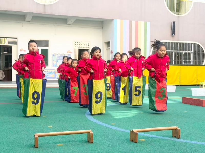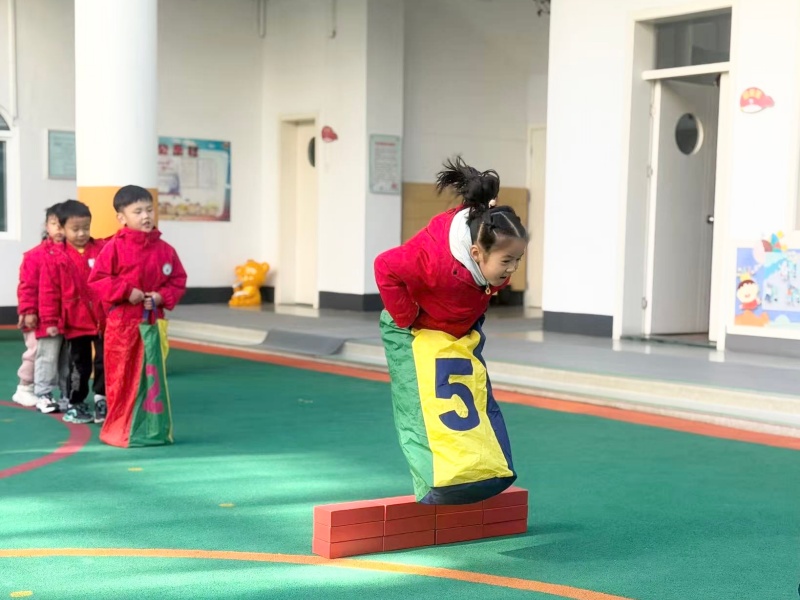 示范环节中,老师提炼出“拉袋贴脚、双脚同跳”的动作要领,孩子们跟着同伴榜样反复练习,不少原本“跳不稳”的孩子逐渐掌握节奏。游戏环节的“仙丹速递”更是将氛围推向最高点:孩子们套着布袋穿梭在“花果山障碍石”间,双脚同步跳跃的动作又稳又快,成功“送丹”后欢呼着与同伴击掌。
