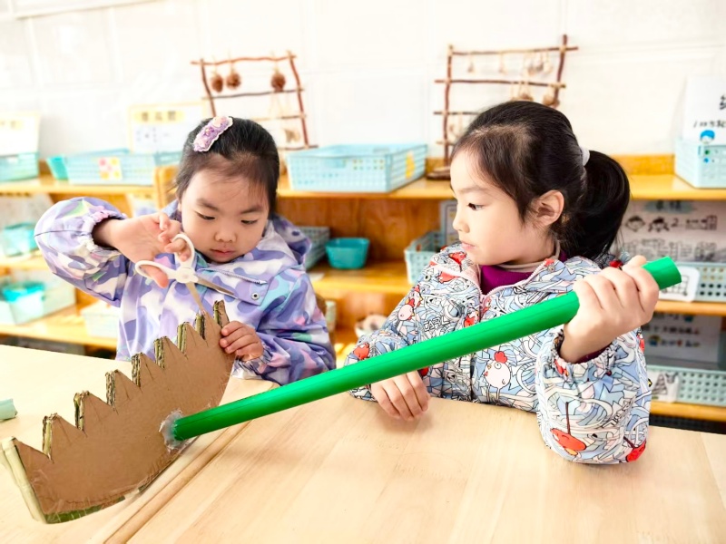 活动中,孩子们自主选择喜欢的角色,有的穿上孙悟空、唐僧的服饰,手持自制的金箍棒、禅杖,在布置好的“舞台”上演绎取经路上的经典情节,一招一式虽稚嫩却充满热情;有的则化身小小手工匠,用彩纸、纸盒、画笔等材料,精心制作金箍棒、芭蕉扇、取经宝箱等道具,专注的神情尽显创造力。