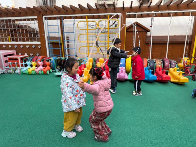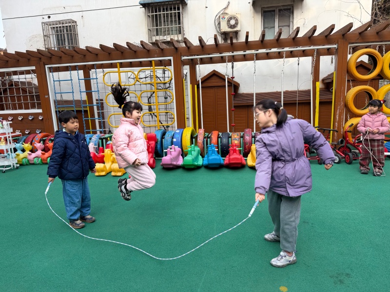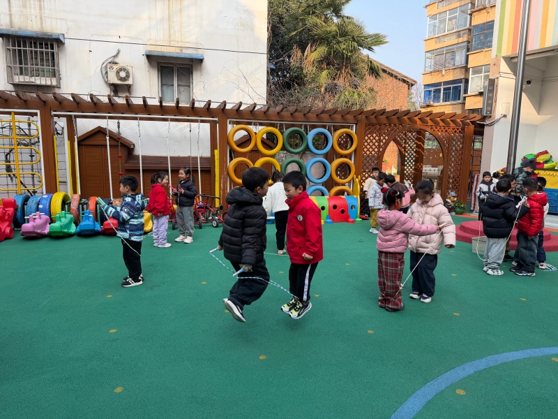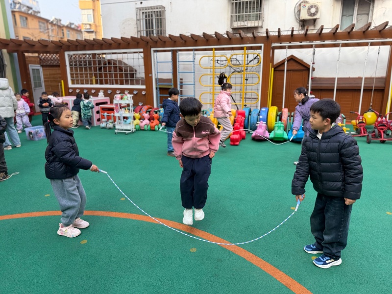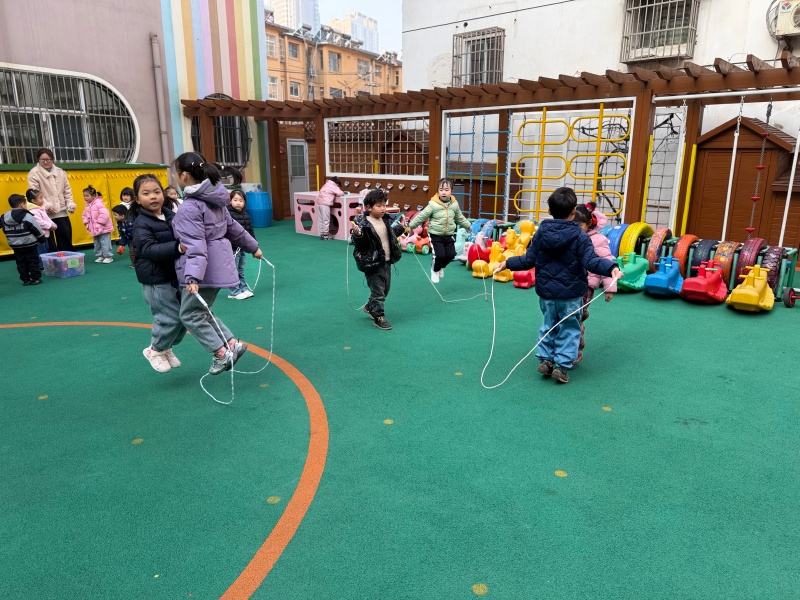 从单人跳的灵活自如,到双人跳的默契配合,再到集体跳的团结协作,孩子们在跳跃中锻炼了身体协调性与耐力,也在互相鼓励中收获了友谊与自信。老师也积极参与其中,手把手指导动作,和孩子们一同感受运动的快乐。