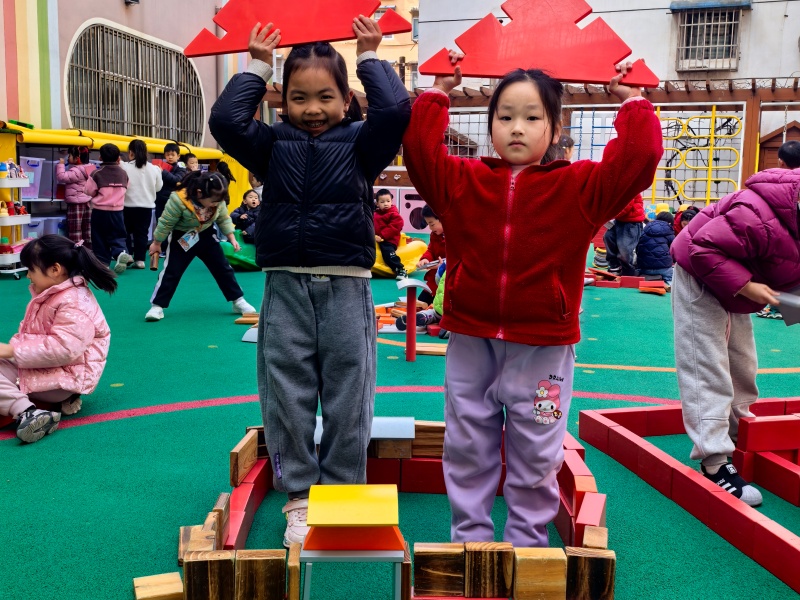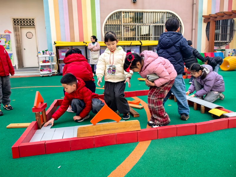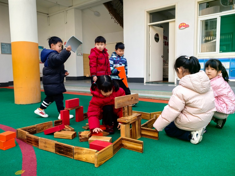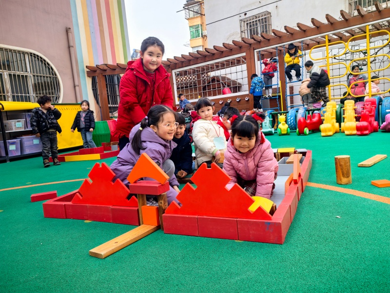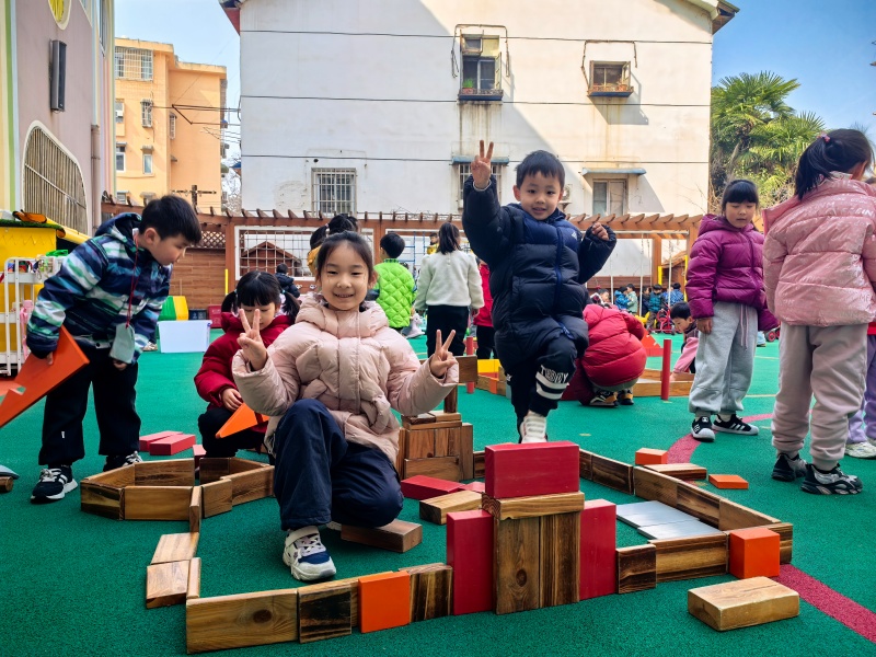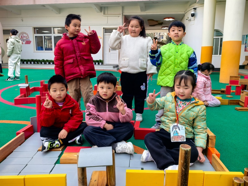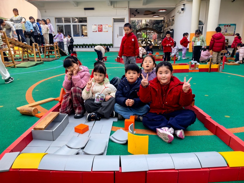 你瞧,操场上一座座“迷你小学”拔地而起:有的孩子用长木块搭起了教学楼的台阶,有的用红色积木围出了校门,还有的细心拼出了教室的窗户。大家分工合作,你搬积木、我拼接,偶尔积木倒塌也不气馁,互相加油鼓劲,在动手与协作中,慢慢靠近心中的小学生活。
