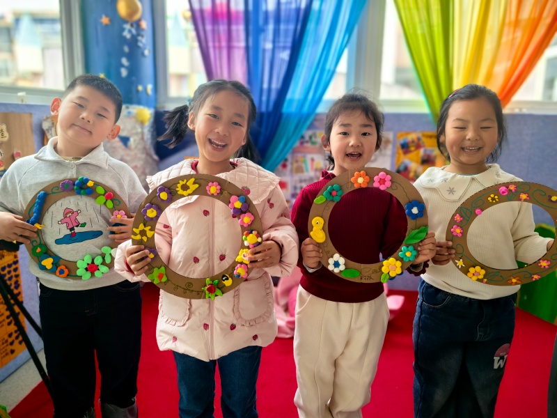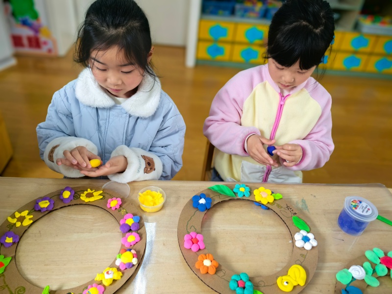 孩子们小心翼翼地将这些精心制作的粘土作品粘贴在装饰好的圆环上,再点缀上翠绿的叶片和精巧的果实。每一个花环都是独一无二的艺术品,承载着童心的美好想象。活动现场洋溢着欢声笑语,仿佛连春风都为之驻足。