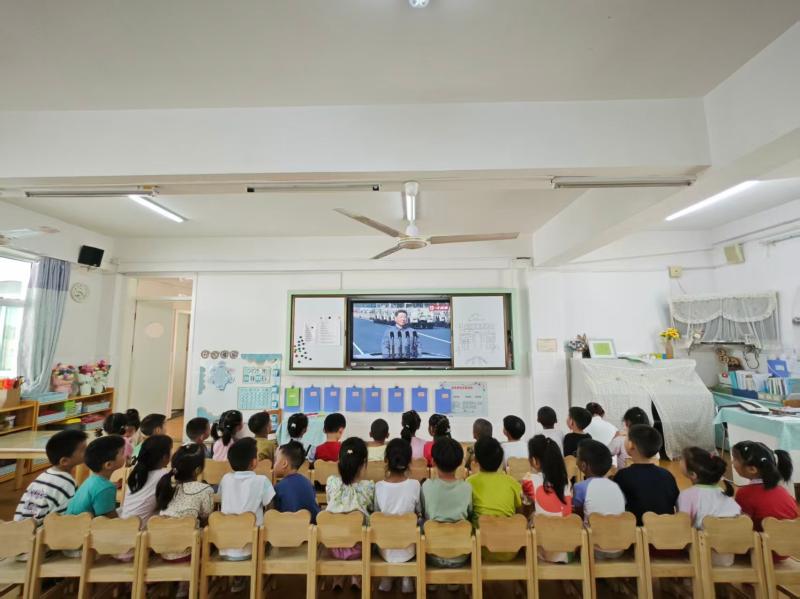 9月3日这天,孩子们围坐在一起,认真观看了阅兵仪式。当看到整齐的队伍、飘扬的国旗时,大家不时发出阵阵惊叹,小脸上满是自豪与崇敬。