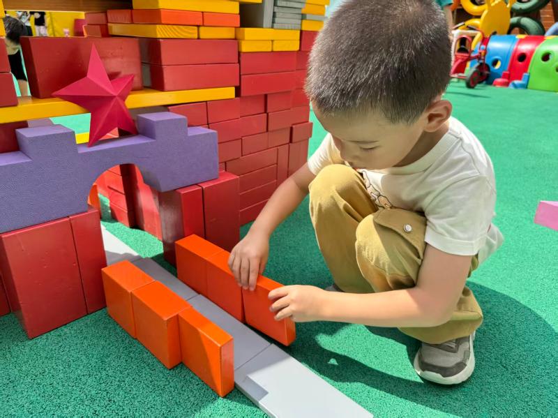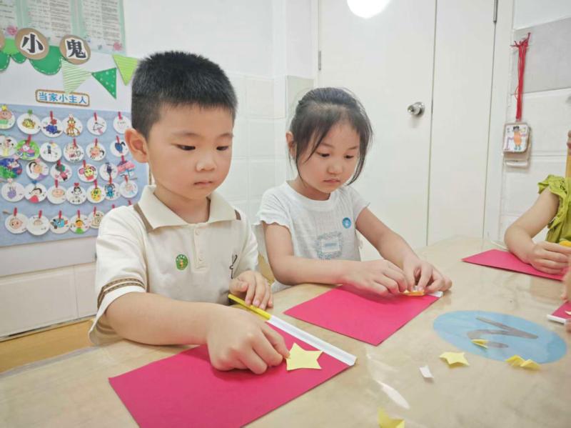 观看结束后,有趣的创作环节开始了。孩子们分成小组,有的专注地粘贴国旗,让鲜红的五星绽放光彩;有的合力用积木搭建天安门,你递一块、我摆一层,忙得不亦乐乎。