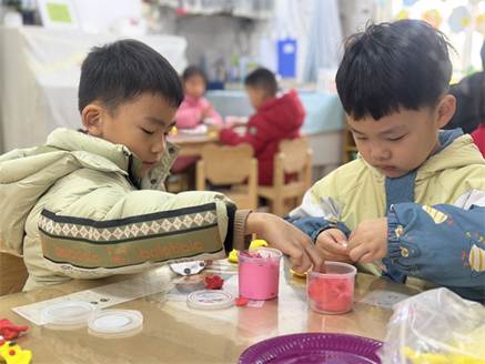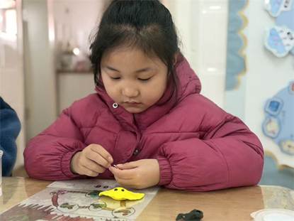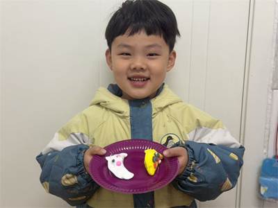 活动中,孩子们围坐在一起,小眼睛亮晶晶地观察着真正的饺子。“老师,它的肚子圆鼓鼓的!”“看,边边上有一圈小花边!”发现了这些秘密后,孩子们便迫不及待地行动起来。他们认真挑选着“馅料”的颜色,小心地把“面皮”摊开,再用自己独特的办法捏出褶子。有的孩子捏出了胖乎乎的元宝饺,有的做出了精致的小月牙饺,每只“饺子”里仿佛都包进了他们天马行空的想象。整个过程中,专注与笑意始终洋溢在每一张小脸上。