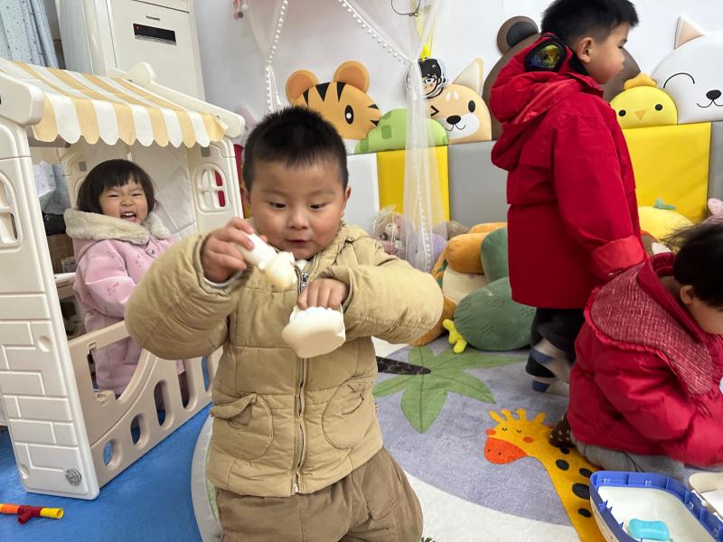 活动现场,迷你灶台、塑料蔬果、毛绒玩偶等道具一应俱全。“妈妈”朵朵抱着布娃娃哼着摇篮曲,轻轻拍打安抚;“爸爸”轩轩手持玩具锅铲,煞有介事地翻炒“饭菜”,还不忘喊同伴“开饭啦”。角落里,几个孩子正围坐“餐桌”分享“水果”,用奶声奶气的语言模拟日常对话:“宝宝要多吃菜菜!”