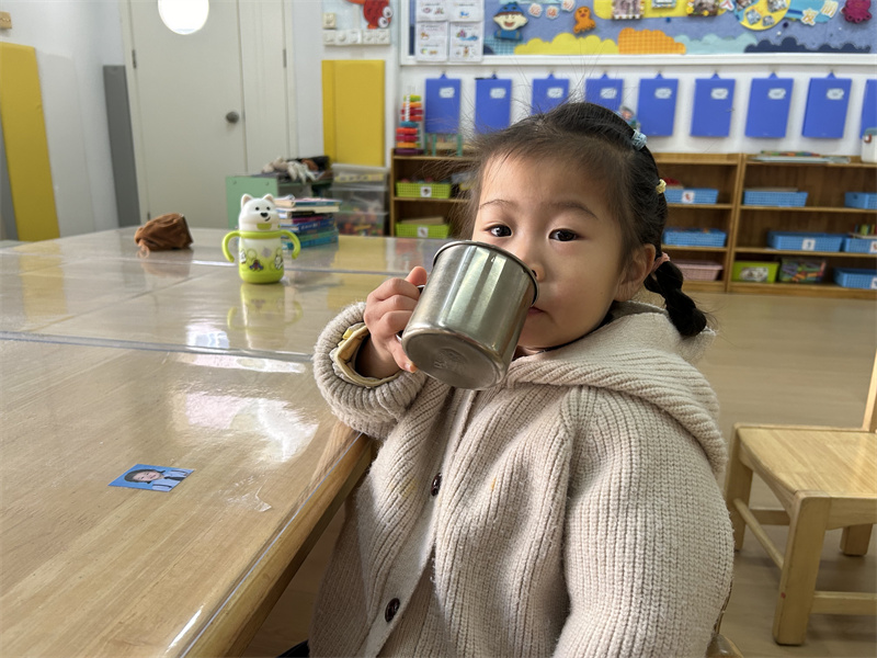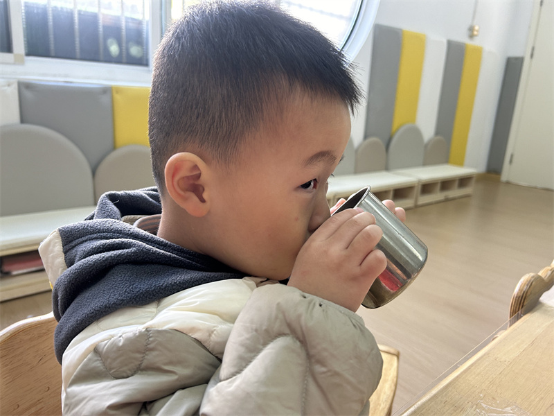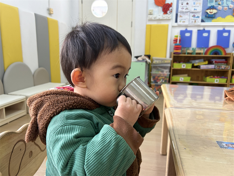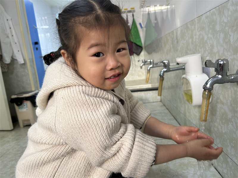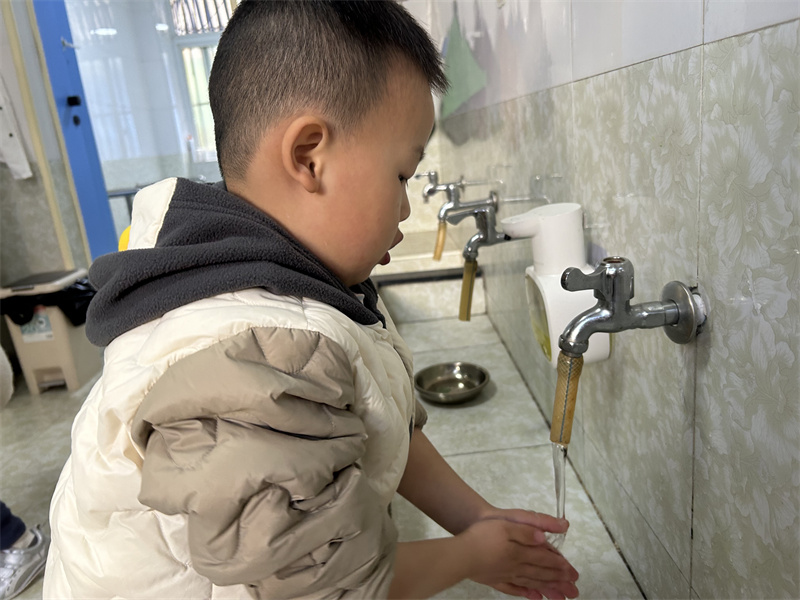 “卷卷袖子湿湿手,打打肥皂搓泡泡……”在欢快的洗手儿歌中,洗手教学活动趣味开启。老师们手把手示范“七步洗手法”,从掌心到指缝、从手腕到指尖,每一个步骤都耐心指导。宝贝们化身“洗手小卫士”,在水池边认真模仿,体验洗手的乐趣。宝贝们深刻理解了“勤洗手、洗好手”的重要性。洗完手宝贝们拿着自己的小水杯,有序排队喝水,还互相提醒 “要多喝水”,养成了主动饮水的好习惯。
