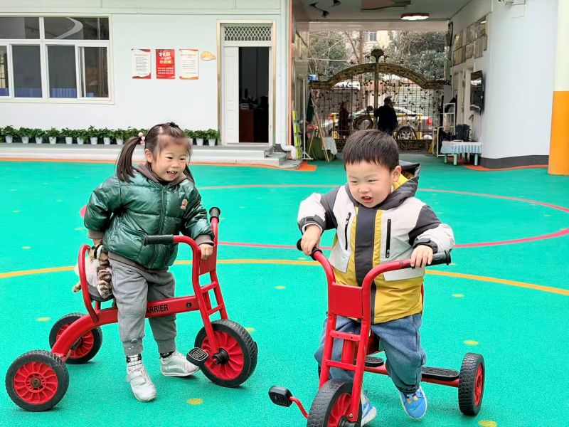 在老师的引导下,孩子们勇敢尝试各类骑行玩具:摇摇马、三轮车、滚筒小车……他们紧握车把,稳稳前行,在绿色操场上你追我赶、结伴同行。