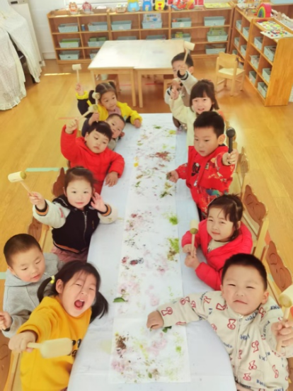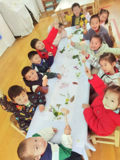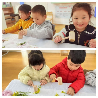 活动前期,孩子们通过周末与父母一起春游踏青,手收集到了花、草、嫩芽等典型的春天的景物,让孩子们在感知春天的美丽景色同时,也能通过不同感官感知春天。活动中,孩子们将收集到的花草、嫩芽放置在洁白的麻布上,然后通过小锤子捶打花草、嫩芽,将花草、嫩芽中的带有颜色的汁水捶打出来,拓印在麻布上。随着此起彼伏的捶打声,麻布上布满了各种颜色,粉的、绿的、黄的、红的,真是五彩缤纷,美不胜收。