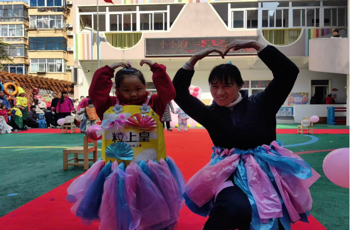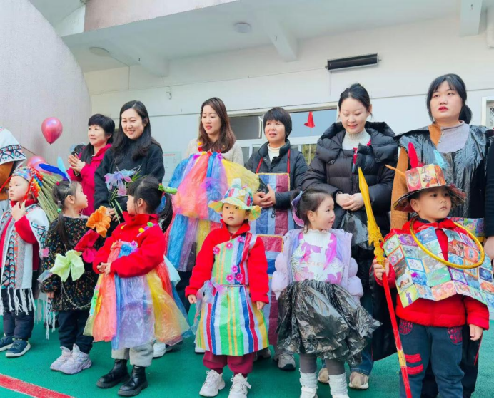 活动当天,幼儿园操场化身为童趣十足的“T台”。伴随着动感欢快的音乐,小模特们自信满满地登台亮相。有的戴着用瓶盖串成的项链,穿着报纸编织的连衣裙优雅踱步;有的身披用旧窗帘改造的披风,手持硬纸板制作的“魔法权杖”霸气登场。孩子们俏皮的表情、灵动的步伐,赢得了现场师生与家长的阵阵掌声和欢呼声。
