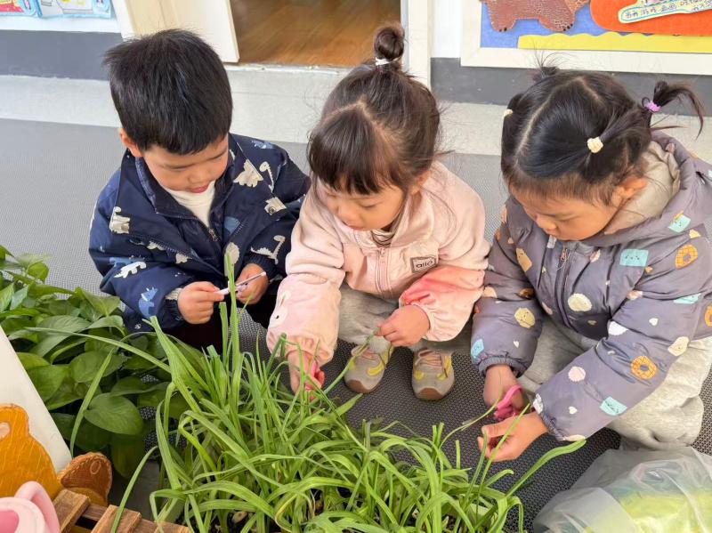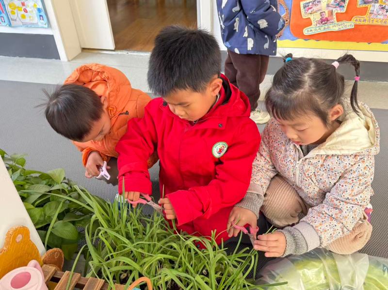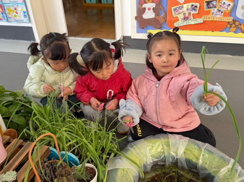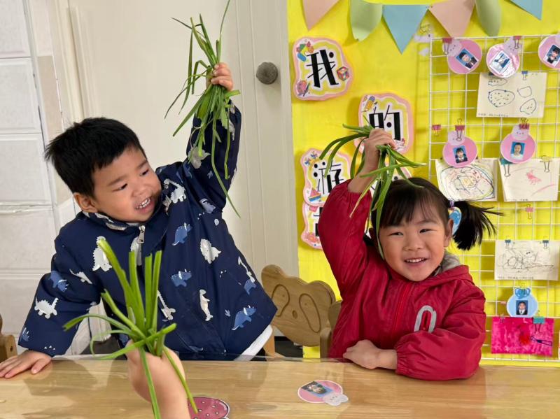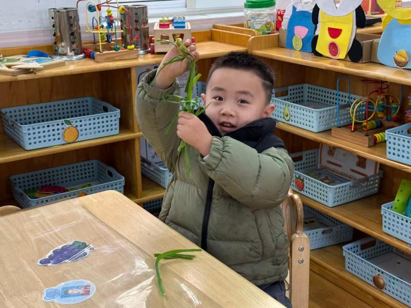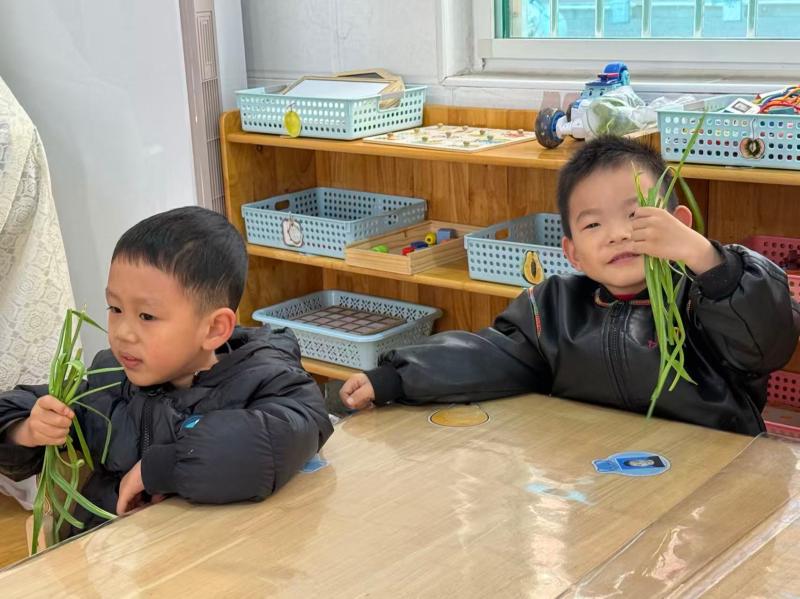 快看!小一班的植物角迎来了丰收时刻,翠绿的蒜苗叶在阳光里轻轻摆动,成了孩子们的“宝贝绿植”。