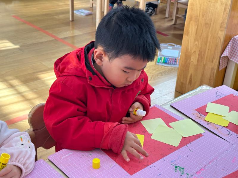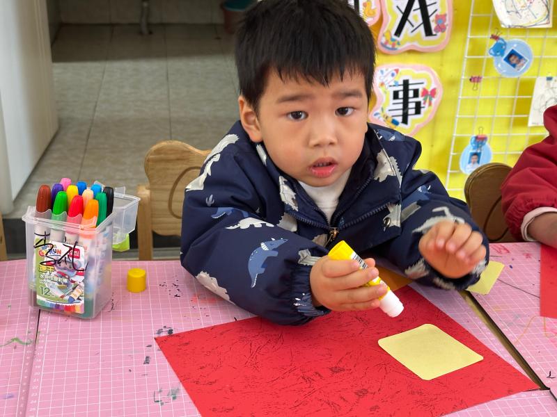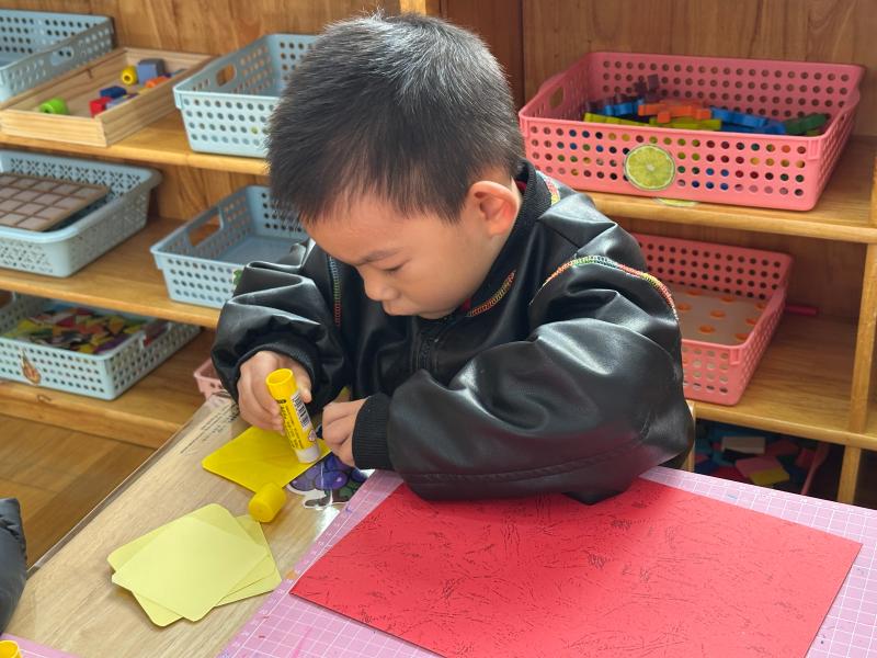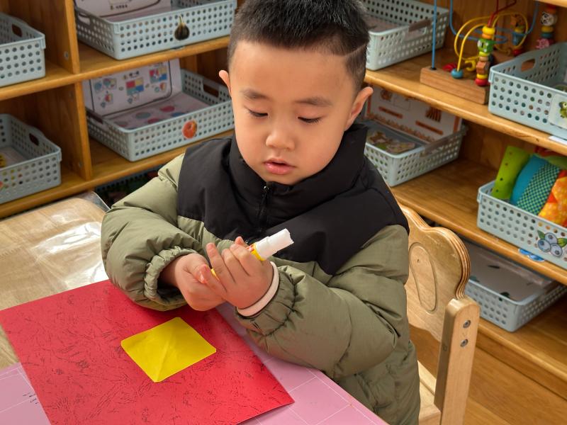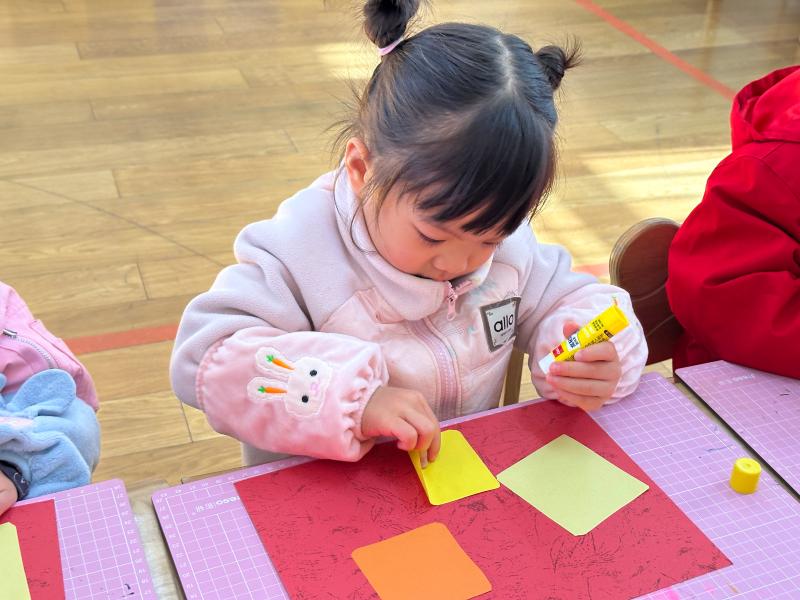 活动开始前,老师通过图片和趣味讲解,向孩子们介绍了黄油小饼干的外形特征,示范了剪贴画的制作步骤。活动中,孩子们化身小小“艺术家”,专注地投入创作:有的用胶棒仔细地将彩色卡纸粘贴在红色底板上,勾勒出饼干的轮廓;有的拿着彩笔为饼干画上格子纹理,让饼干变得更逼真;还有的发挥创意,给饼干添上可爱的眼睛、嘴巴和小帽子,让黄油小饼干变成了一个个俏皮的“饼干小人”。