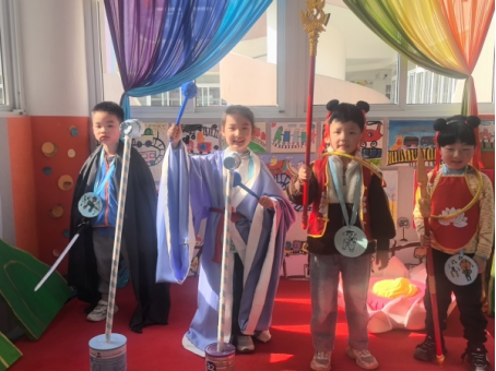 表演前,幼儿能够根据需要,有目的地利用服装道具对自己和舞台进行装扮和布置。表演中,幼儿能用比较清楚、连贯的语言进行演出。且可以适当地运用肢体动作、面部表情来展现角色的性格特征。也能够有意识地与同伴扮演的其他角色进行互动。