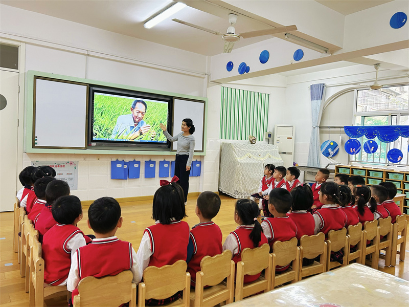 为了让孩子了解稻米从播种到收获的艰辛,老师通过生动的图片、视频和有趣的绘本故事,为孩子们讲解了“世界粮食日”的由来和意义。当孩子们了解到袁隆平爷爷毕生致力于杂交水稻研究,只为让大家都吃饱饭的感人故事时,纷纷感叹他的伟大。“杂交水稻之父”的伟大形象与“一粒米”的艰辛旅程,让孩子们深刻体会到粮食的来之不易,懂得了“谁知盘中餐,粒粒皆辛苦”的真正含义。