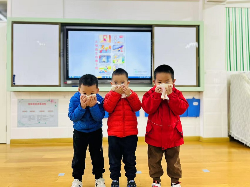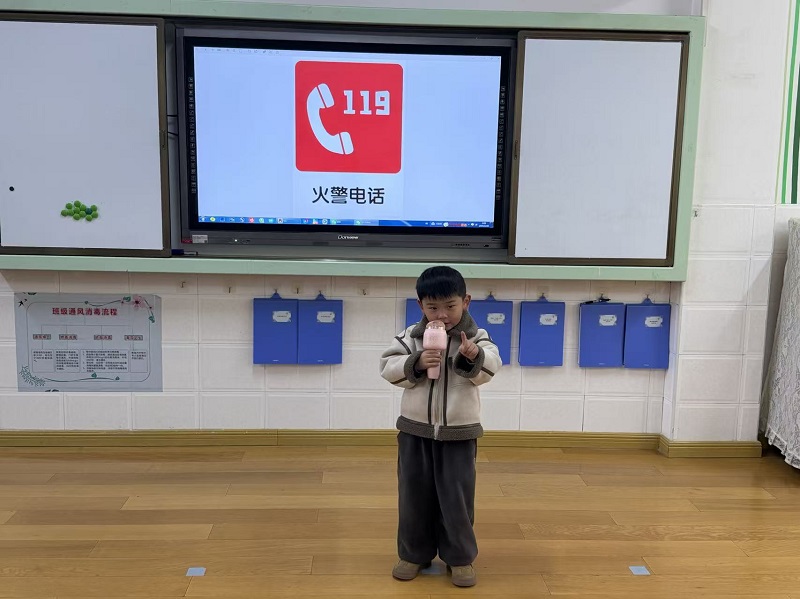 随后,进入实操学习环节。针对火灾中如何正确防护,老师现场示范了“捂口鼻”的正确方式:“要用湿毛巾紧紧捂住嘴巴和鼻子,弯腰低头,沿着墙壁快速逃生。”孩子们纷纷拿出提前准备好的小毛巾,跟着老师一步步练习,小手紧紧按住毛巾,认真模仿弯腰的姿势,生怕自己做得不标准。在学习拨打119报警电话时,老师扮演接线员,引导孩子们学习准确表述:“要告诉消防员叔叔家里的地址、发生了什么事,还有自己的名字哦!”孩子们轮流进行模拟报警,从一开始的紧张卡顿,到后来能清晰说出关键信息,进步十分明显。