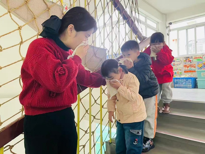 随着模拟火灾警报声响起,老师立即组织孩子们用湿毛巾捂住口鼻,弯腰低姿,沿着预定的安全路线,快速、有序地撤离到操场的安全区域。到达指定地点后,老师迅速清点人数,确保每一位小朋友都安全撤离。整个演练过程紧张而有序,孩子们严格按照所学方法操作,展现出了良好的应急反应能力。