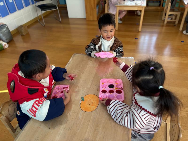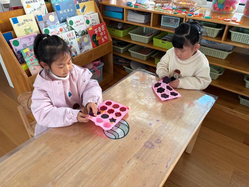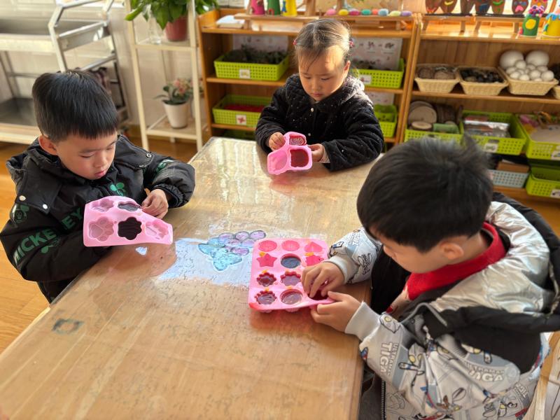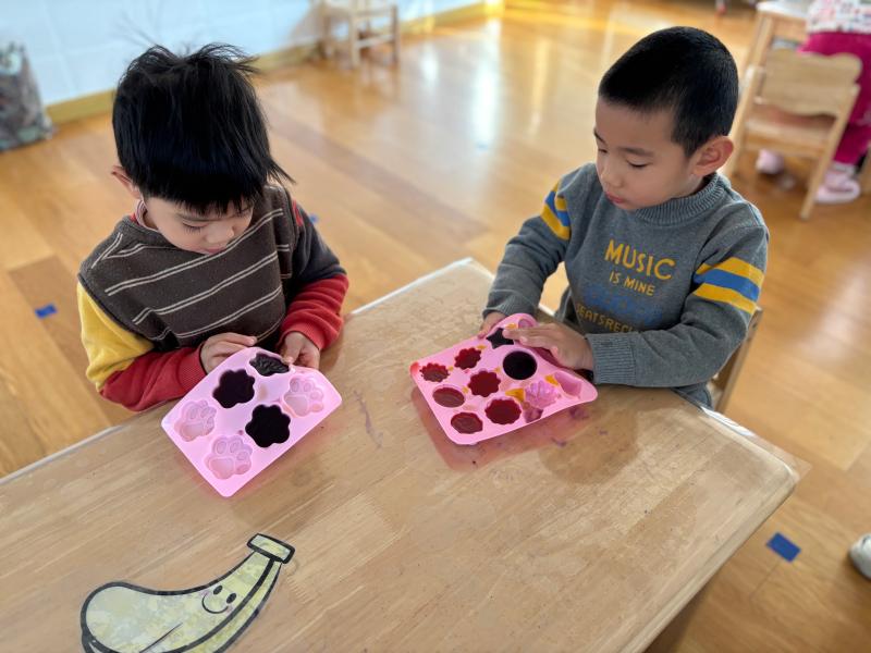 将各种材料按比例混合。孩子们全神贯注地观察操作:小心翼翼地搅拌、仔细观察材料的变化、耐心等待皂液凝固……经过一中午的等待,皂液完全凝固成型,活动迎来了最激动人心的环节——脱模。孩子们用小手轻轻推动模具底部。孩子们小心翼翼地捧出自己制作的肥皂:光滑的触感、淡淡的植物香气、还有亲手赋予的形状——一颗星星、一朵小花、一只小熊……每一块都承载着满满的成就与喜悦。孩子们兴奋地计划着如何使用自己的劳动成果。