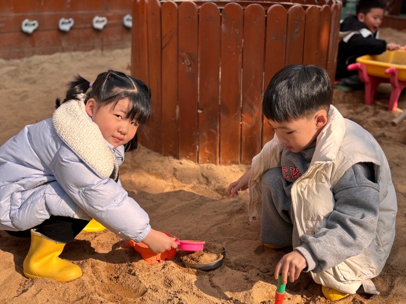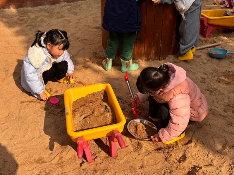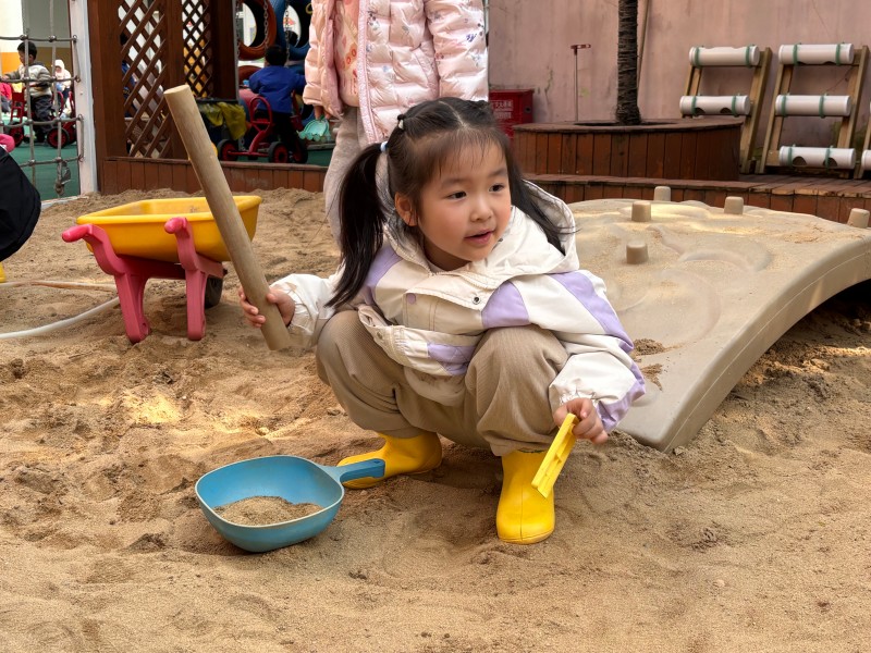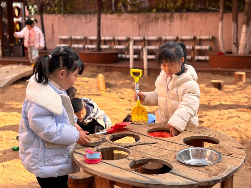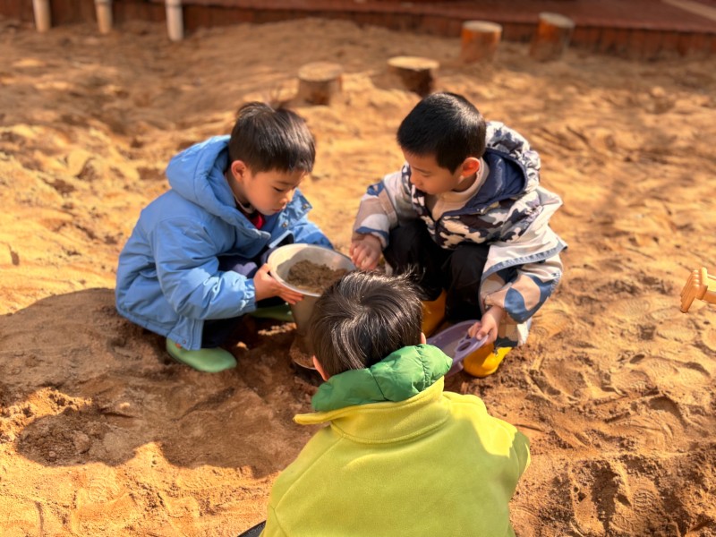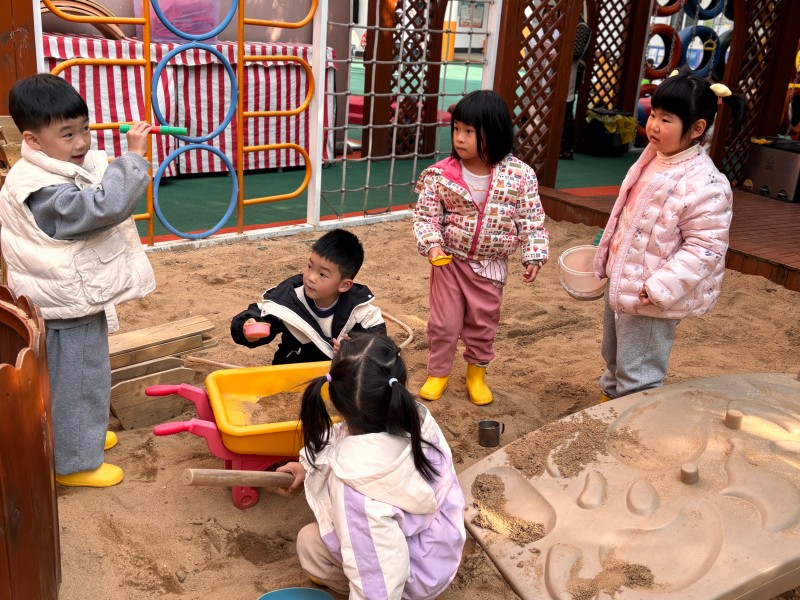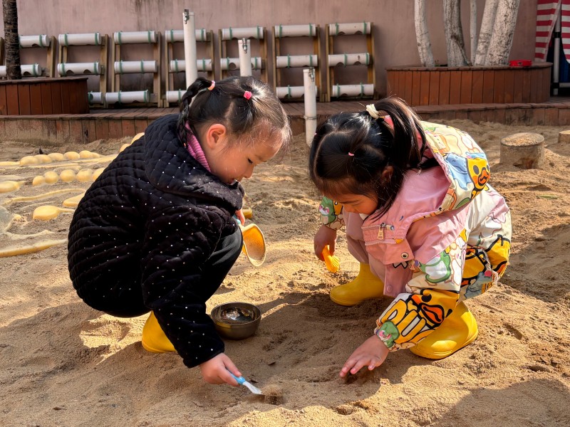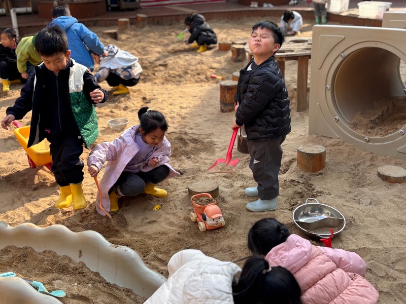 阳光洒在孩子们红扑扑的小脸上,映照着他们专注又快乐的神情。他们在触摸、挖掘、堆砌的过程中,不仅锻炼了手部精细动作和手眼协调能力,更在自由探索中学会了分享与合作。没有固定的玩法,没有统一的答案,孩子们用想象力和创造力,把普通的沙粒变成了充满魔力的游戏材料,在欢声笑语中收获着成长与喜悦。
