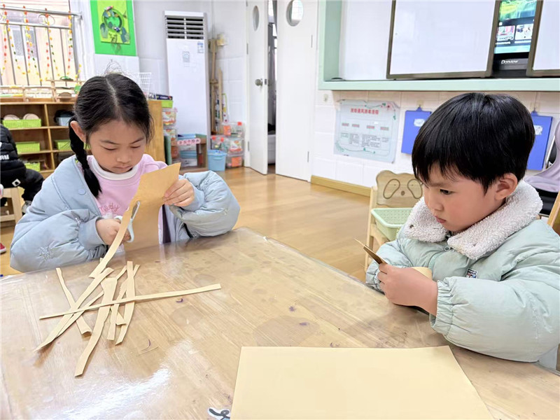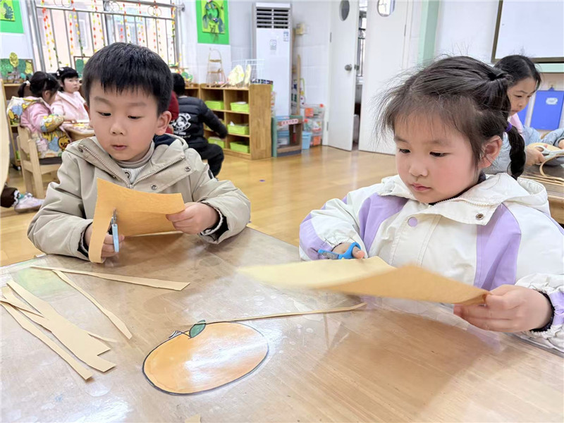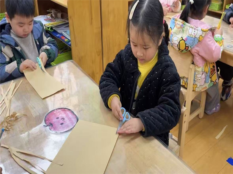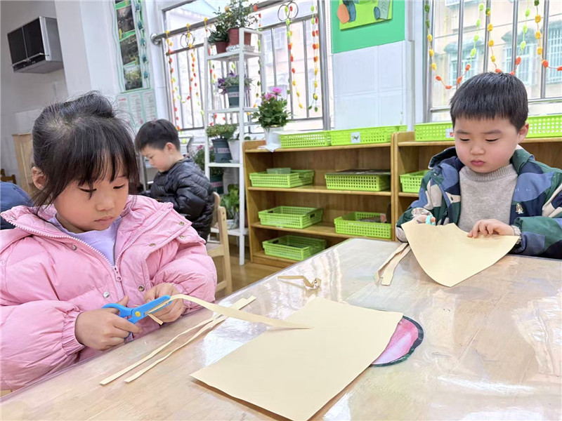 尽管动作还略显稚嫩,但每一位孩子都沉浸在创作的快乐中。剪刀“咔嚓咔嚓”的声响,与孩子们的轻声交流交织在一起,构成了温馨又生动的课堂画面。