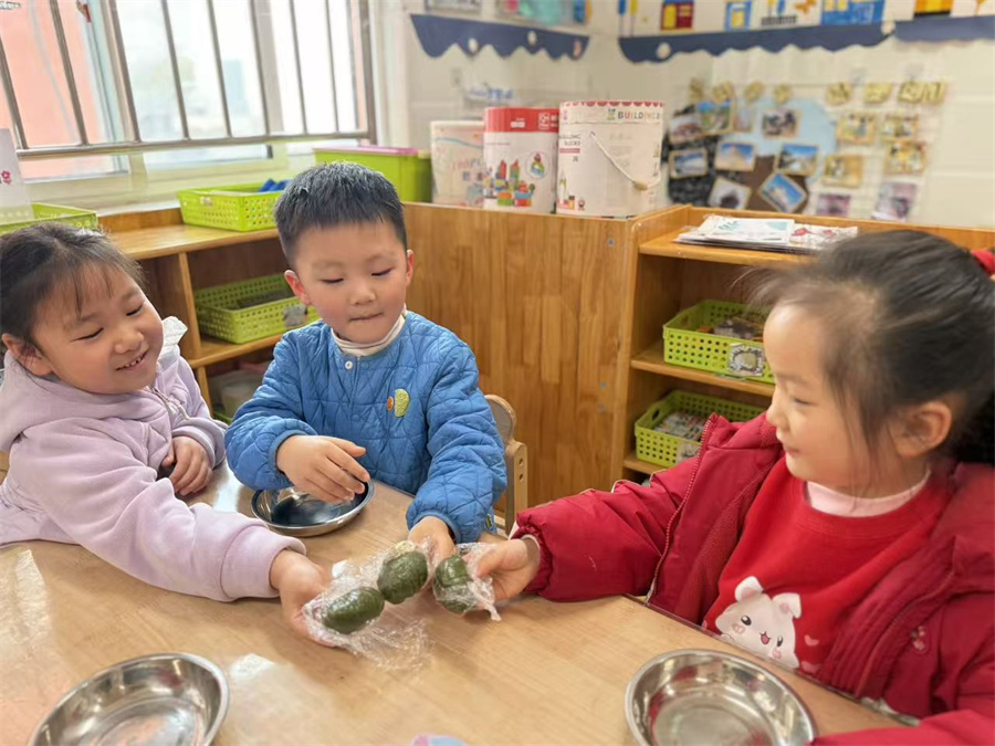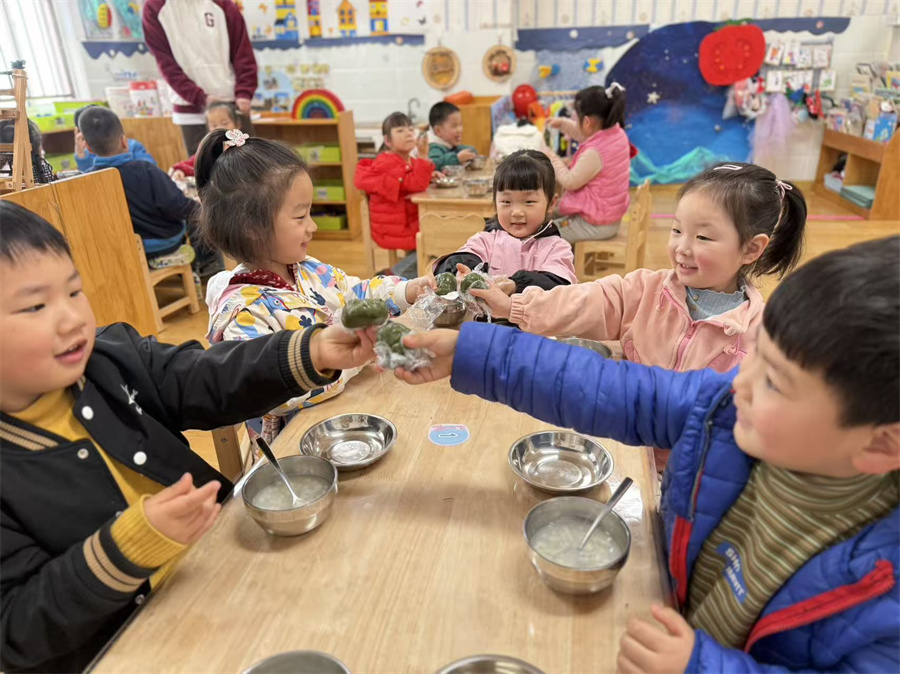活动当天,教室里弥漫着春天的气息。桌上摆放着碧绿软糯的青团、清甜爽口的荸荠甜汤,这些都是江南地区春季最具代表性的时令美食。孩子们围坐在一起,眼中满是好奇与期待。在老师的引导下,孩子们先观察食物的颜色和形态,再轻轻闻一闻,最后细细品尝。“青团是绿色的,像小草一样!”“荸荠咬起来脆脆的,好甜呀!”孩子们用稚嫩的语言分享着自己的发现。